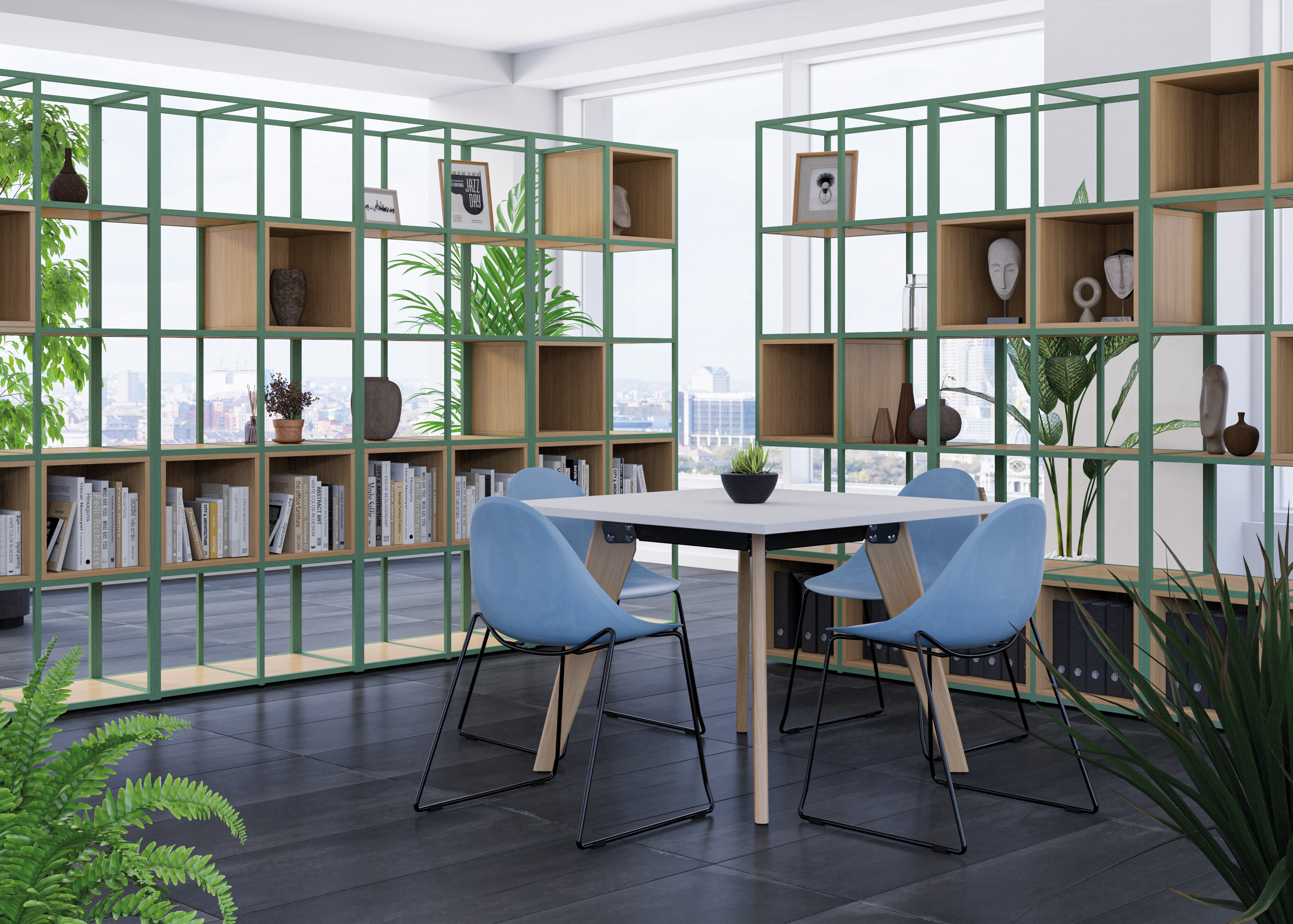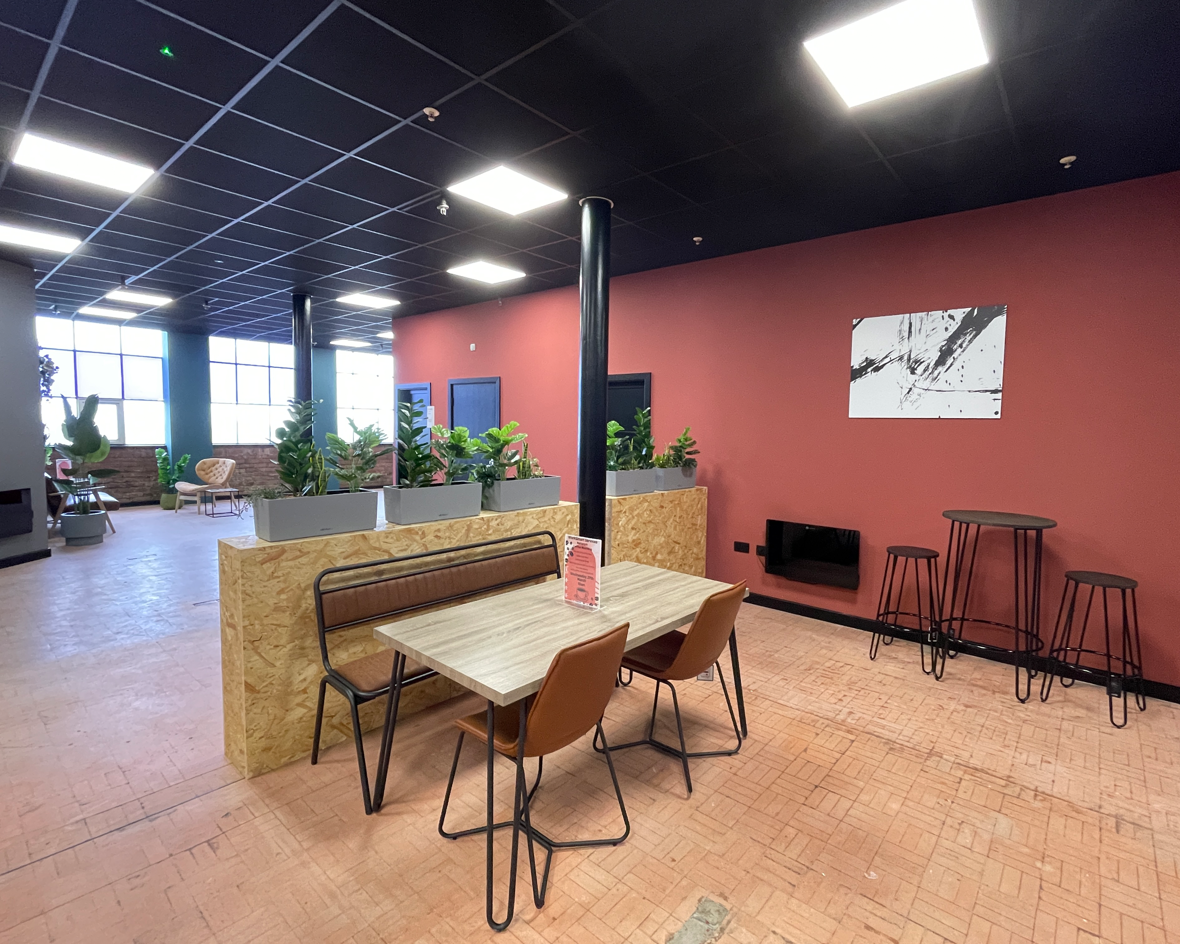 - Planters & acoustic panels bring texture and calm, softening sound and adding a touch of biophilic design.