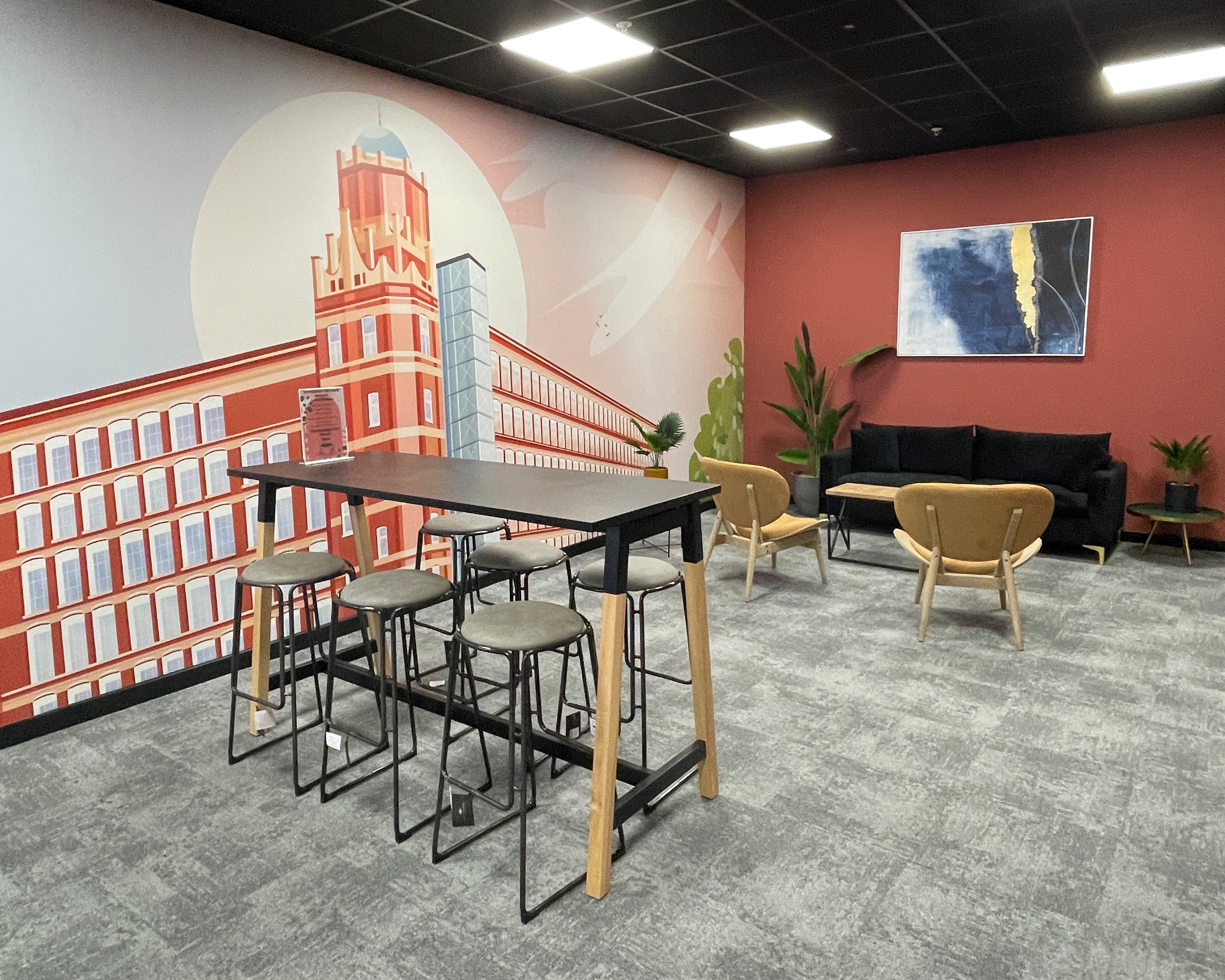 At Broadstone Mill, we refurbished a workspace within a heritage building, remaining respectful of the airy, open mill structure whilst creating a communal environment that can be used by different workers, teams and businesses. Furniture, plants and wall art subtly zone the space, providing different areas for focus. The result is a setting that feels open, welcoming and quietly productive. Read the full case study here.
